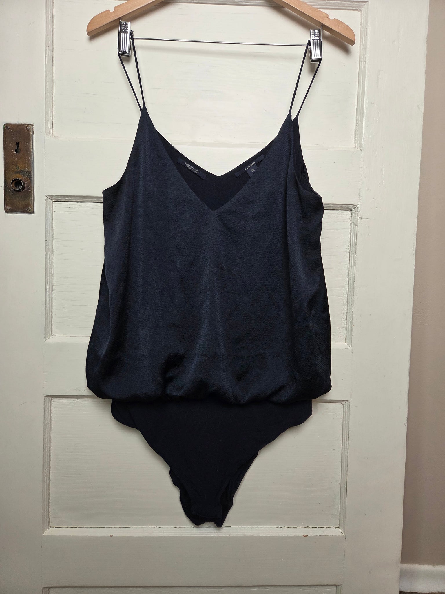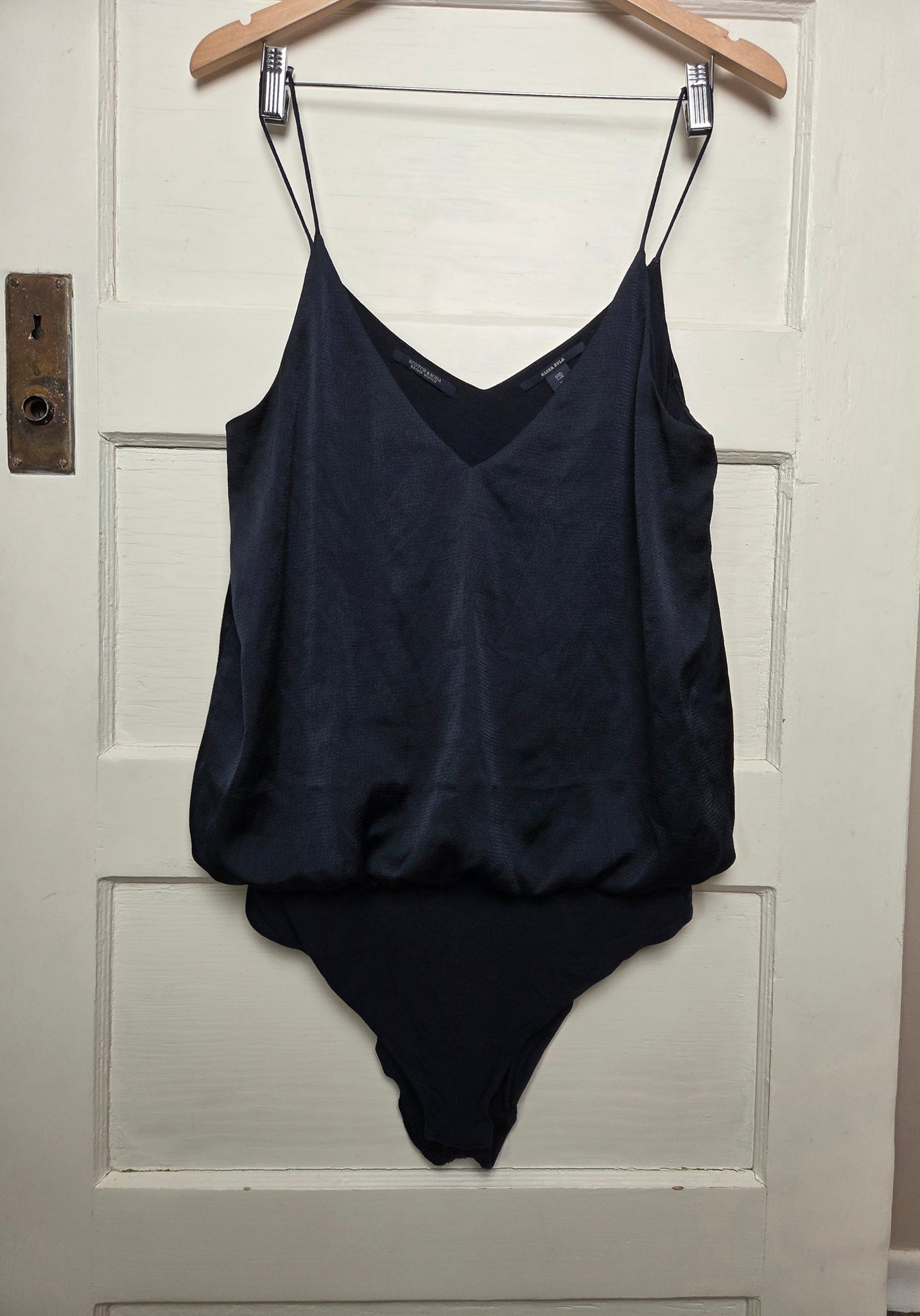 Women's spaghetti-strap V-neck bodysuit (also called a camisole bodysuit or leotard-style top) from the brand Scotch & Soda, specifically under their Maison Scotch line.