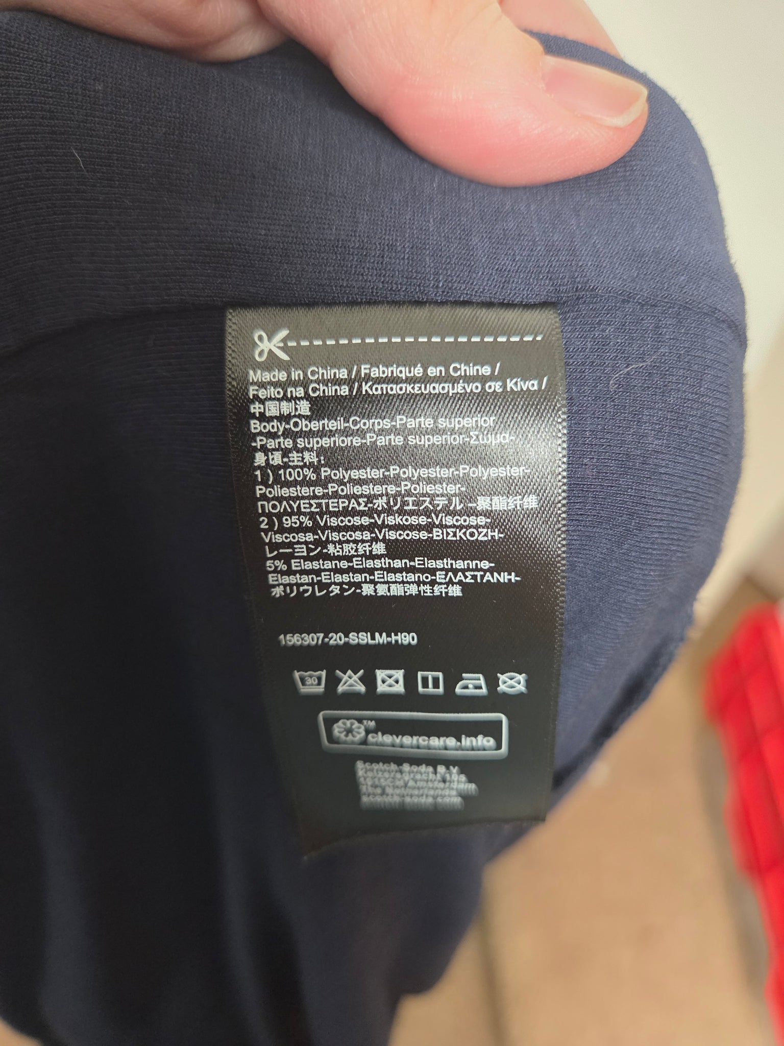 It's produced by Scotch & Soda B.V. (Amsterdam-based Dutch brand), with the Clevercare™ symbol and their standard washing icons.