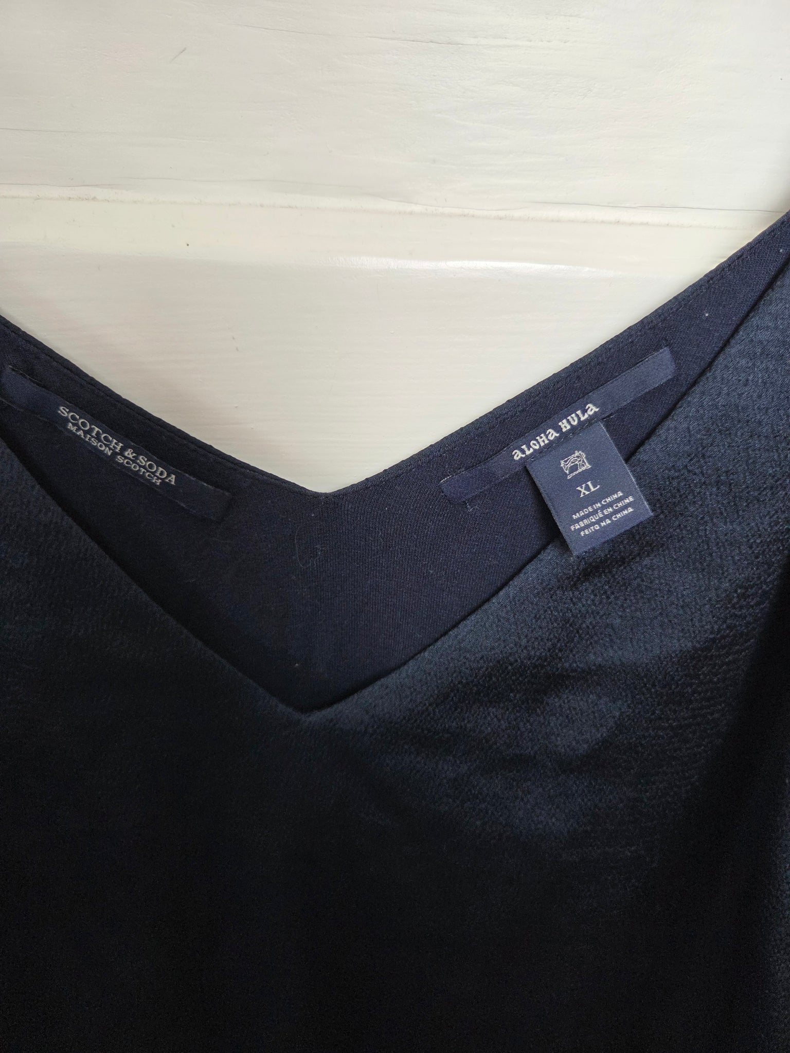 The neckline tag shows "SCOTCH & SODA" / "MAISON & SODA" / "ALOHA HULA" — "Aloha Hula" appears to be a seasonal collection name or capsule/print theme used by Scotch & Soda / Maison Scotch (they've released various "Aloha Hula" items often with a relaxed, boho, or resort-inspired vibe).